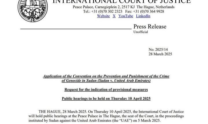 أكد بيان من محكمة العدل الدولية انعقاد الجلسة الأولى في 10 ابريل لمناقشة طلب جمهورية السودان باتخاذ إجراءات تحفظية ضد دولة الامارات. وستعقد محكمة العدل الدولية، جلسات استماع علنية في قصر السلام بلاهاي، مقر المحكمة، للنظر في الدعوى التي رفعها السودان ضد الإمارات العربية المتحدة (“الإمارات العربية المتحدة”) في ٥ مارس ٢٠٢٥.