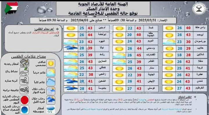 توقعت الهيئة العامة للأرصاد الجوية أن ترتفع درجات الحرارة بشقيها العظمى والصغرى إرتفاعاً طفيفاً في جميع أنحاء البلاد، عليه يكون الطقس حار الي حار جداً نهاراً و معتدل ليلاً في شمال، شمال غرب و غرب البلاد و حار جداً نهاراً و حار نسبياً ليلاً في شرق، اواسط وجنوب البلاد.