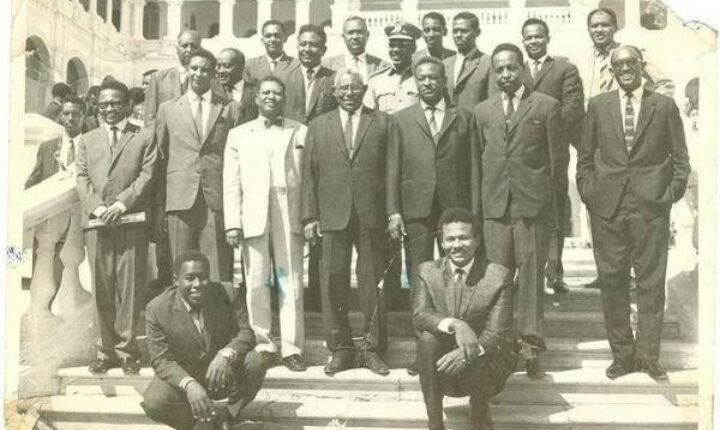 هذه الصورة النادرة أمام القصر الجمهوري تجمع بين لفيف من الفنانيين السودانيين الكبار أحمد المصطفى ومحمد عثمان وردي وعثمان حسين ومعهم الشاعر الفيتوري وعدد من الفنانين والعازفين بينهم ود الحاوي ومحمدية، وكبار موظفي الدولة في ذلك الزمان الرحيب، وقد أحاط الجميع بشراً وترحيباً بالزعيم إسماعيل الأزهري رافع علم الأستقلال ورئيس مجلس السيادة، وبدأوا يرددون مقطعاً من صه يا كنار وضع يمينك في يدي للصاغ الشاعر محمود أبوبكر وكانت مفاجأة الجميع كبيرة حين أنشد الزعيم الأزهري مقطعاً من الأنشودة الوطنية الشهيرة هذه بصوته الرخيم، وبالمناسبة فقد كان الأزهري عازف عود ممتاز أشتهر به في مناشط كلية غردون حين كان طالبا بها.