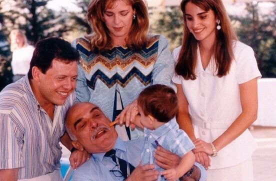 لقطة حميمة للأسرة المالكة بالمملكة الأردنية الهاشمية يظهر فيها الملك الراحل حسين بن طلال وزوجته البريطانية نورا أبنه الملك الحالي عبد الله بن الحسين وزوجته رانيا وحفيده الحسين الذي أصبح هذه الأيام عريساً فهل يعيد العرس الملكي لتلك الأرض الطبية بعض الفرح المهاجر رغم أن حدودها تبكي دماً ودمعاً على الضفة الغربية الجريحة وغزة الدامية.