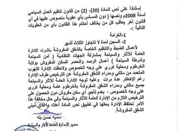 ونبهت في حالة المخالفة تحافظ الإدارة حقها فى تطبيق نص المادة (20) – (2) من قانون تنظيم العمل السياحى لسنة 2008 وعقوبتها الغرامة والسجن لمدة لا تتجاوز ثلاثة أشهر.
