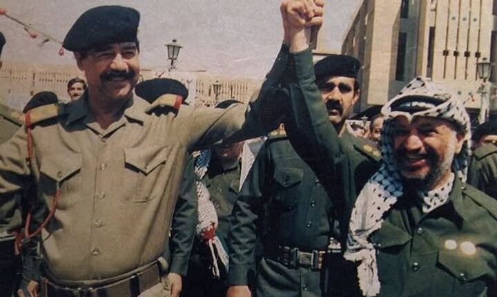 الصورة لقطة نادرة للزعيم العراقي الشهيد صدام حسين، والزعيم الفلسطيني الشهيد ياسر عرفات.