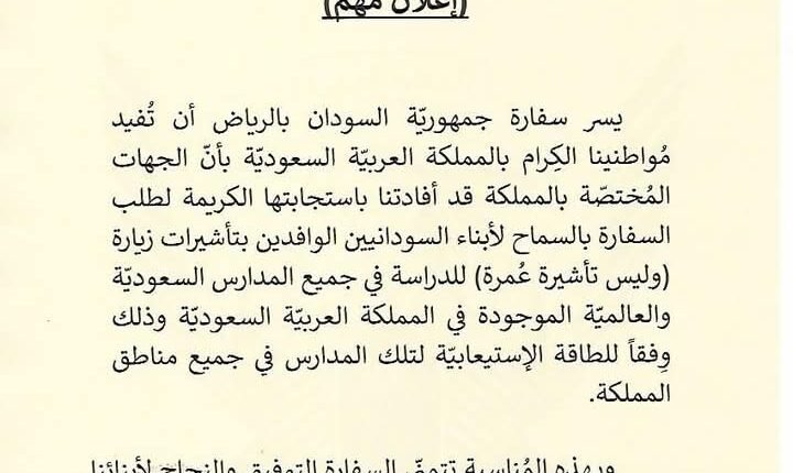 أعلنت سفارة جمهورية السودان بالرياض أن الجهات المختصة بالمملكة العربية السعودية أفادت باستجابتها الكريمة لطلب السفارة للسماح لأبناء السودانيين الوافدين بتأشيرات زيارة (وليس تأشيرة عمرة) للدراسة في جميع المدارس السعودية والعالمية الموجودة في المملكة العربية السعودية.