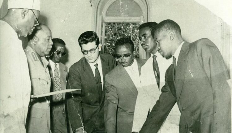 اللقطة — للتذكر والاعتبار والمقارنة — لخريجي دفعة (61) لكلية الطب بجامعة الخرطوم وهم يؤدون القسم، حيث يظهر في الصورة الرئيس الفريق إبراهيم عبود، ومفتي الديار، ووزير الصحة محمد أحمد علي.