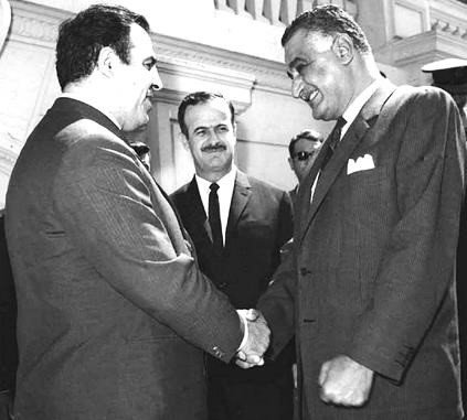 الصورة يظهر فيها: الرئيس جمال عبد الناصر، وحافظ الأسد، والرئيس السوري الأتاسي