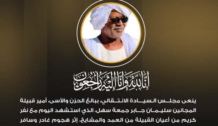 ينعى مجلس السيادة الانتقالي، ببالغ الحزن والأسى، أمير قبيلة المجانين سليمان جابر جمعة سهل، الذي استشهد اليوم مع نفر كريم من أعيان القبيلة من العمد والمشايخ، إثر هجوم غادر وسافر شنته مليشيا آل دقلو الإرهابية، خلال اجتماع صلح عقدته الإدارة الأهلية بمنطقة المزروب.