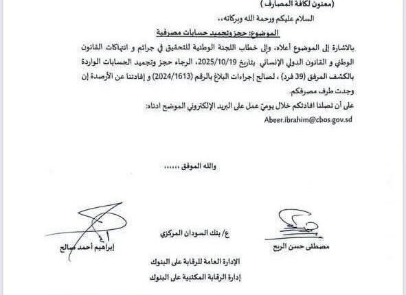 أصدر بنك السودان المركزي، قرارًا بتجميد وحجز حسابات (39) من القادة السياسيين بما يسمى بصمود وتأسيس وصحفيين وإعلاميين.
