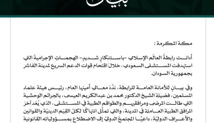 أدانت رابطةُ العالَم الإسلامي -باستنكارٍ شديدٍ- الهجماتِ الإجراميةَ التي استهدفت المستشفى السعودي، خلالَ اقتحام قوات الدعم السريع لمدينة الفاشر بجمهورية السودان.