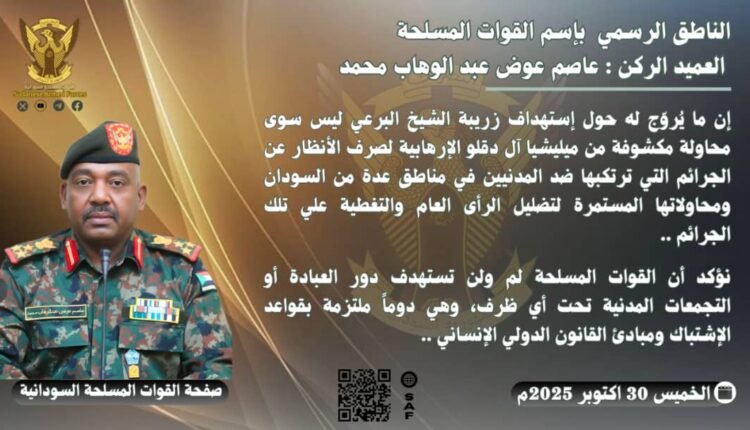 قال الناطق الرسمي بإسم القوات المسلحة العميد الركن عاصم عوض عبدالوهاب إن ما يُروّج له حول إستهداف زريبة الشيخ البرعي ليس سوى محاولة مكشوفة من ميليشيا آل دقلو الإرهابية لصرف الأنظار عن الجرائم التي ترتكبها ضد المدنيين في مناطق عدة من السودان ومحاولاتها المستمرة لتضليل الرأى العام والتغطية علي تلك الجرائم.