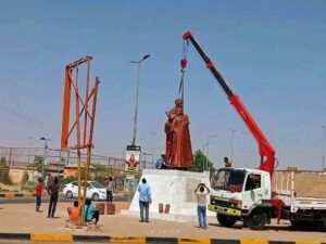 أصدرت السلطات المختصة قرارا بإزالة التمثال الذي تم تداول صوره على نطاق واسع من شارع النيل بأمدرمان، وذلك بعد أن واجهت الخطوة عاصفة من الانتقادات على وسائط التواصل الاجتماعي. وظهر أمس أحد الأشخاص في مقطع فيديو قال فيه إن التمثال يجسد مشهدا لزيارة رئيس مجلس السيادة الفريق أول ركن عبد الفتاح البرهان إلى معسكر لنازحي الفاشر بالولاية الشمالية، فيما قالت رواية أخرى أن التمثال يشكل رمزية للجندي العائد وتم البدء في صنعه قبل زيارة البرهان للنازحين.