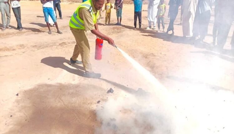 نظم الدفاع المدني بالولاية الشمالية بمخيم نازحي الفاشر بالعفاض بمحلية الدبة، محاضرة عملية حول طرق التعامل مع الحرائق وإستخدام طفايات الحريق داخل المخيم.
