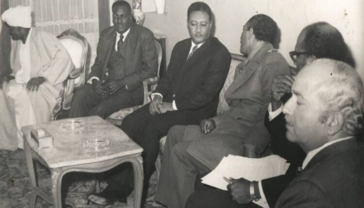 لقطة نادرة للرئيس المصري الراحل أنور السادات في إحدي زياراته للخرطوم في حديث هامس مع الرئيس الراحل جعفر نميري ويظهر في الصورة العميد عمر الحاج موسى وزير الثقافة والإعلام و الدكتور منصور خالد وزير الخارجية ووزير الخارجية المصري إسماعيل فهمي.