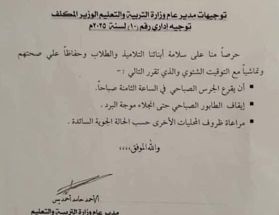 أصدر الأستاذ أحمد حامد أحمد يس، المدير العام لوزارة التربية والتعليم بولاية نهر النّيل، الوزير المُكَلّف، توجيهاً إداريّاً لإدارات المدارس بالمراحل الثلاث (الابتدائي، والمتوسّط،والثّانوي) عبر الإدارات العامّة للتعليم بالرّئاسة والمحليّات، وقضى التّوجيه الإداري بأن يتم قرع الجرس الصّباحي بالمدارس عند السّاعة الثّامنة صباحاً وإلغاء الطّابور الصّباحي إلى حين انجلاء موجة البرد، مع مراعاة ظروف المحلّيّات الأخرى حسب الحالة المناخيّة السّائدة.