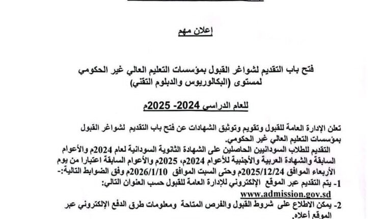 وأوضحت الإدارة أن التقديم متاح للطلاب السودانيين الحاصلين على الشهادة الثانوية السودانية للعام 2024 والأعوام السابقة، وكذلك الحاصلين على الشهادات الثانوية العربية والأجنبية للأعوام 2024 و2025 والأعوام السابقة، وذلك اعتباراً من يوم الأربعاء 24 ديسمبر 2025 وحتى يوم السبت 10 يناير 2026 .