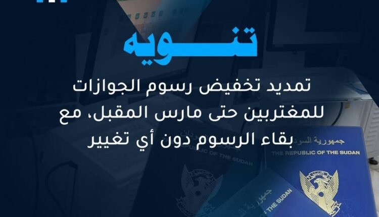 أعلنت الإدارة العامة للجوازات والهجرة عن تمديد العمل بقرار تخفيض رسوم استخراج الجوازات بنسبة 50% حتى نهاية شهر مارس المقبل، وذلك تنفيذًا لقرار رئيس مجلس الوزراء الصادرة في أكتوبر الماضي، والتي هدفت إلى تخفيف الأعباء المالية عن المواطنين السودانيين المقيمين بالخارج.