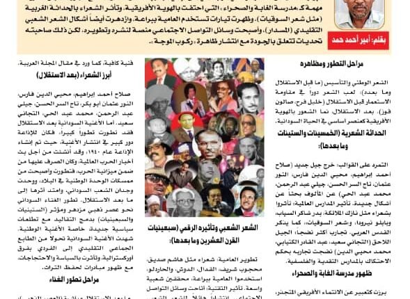صلاح أحمد إبراهيم، محيي الدين فارس، النور عثمان أبو بكر، تاج السر الحسن، جيلي عبد الرحمن، محمد عبد الحي، التجاني سعيد. أما الأغنية السودانية بعد الاستقلال فقد تطورت تطوراً كبيراً، فكان للإذاعة دور كبير في انتشار الأغنية، حيث تم إنشاء الإذاعة عام ١٩٤٠، وقد أُنشئت من أجل بث أخبار الحرب العالمية، وكان الصرف عليها من ضمن ميزانية الحرب، فتطورت وأصبحت من ممسكات الوحدة الوطنية في البلاد، ووحدت وجدان الشعب السوداني، وامتد أثرها إلى ما بعد الاستقلال. تطور الغناء السوداني نحو عصر ذهبي مزدهر ومؤثر (الستينيات والسبعينيات) بدمج التقاليد مع تطلعات سياسية جديدة، خاصة الأغنية الوطنية. شهدت الأغنية السودانية تحولاً من الطابع الجماعي التقليدي إلى الفردي بفرق أوركسترالية، وتأثرت بالسياسة والاحتجاجات، مع ظهور مبادرات لحفظ التراث.