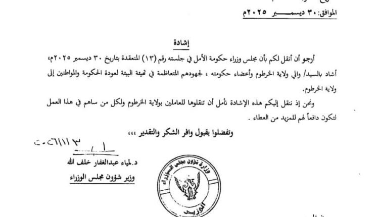 مجلس وزراء حكومة الأمل يشيد بوالي الخرطوم وأعضاء حكومته