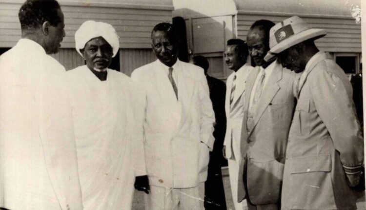 واحدة من اللقطات النادرة لمجموعة من أعمدة حكومة “السيدين” التي أُسست عام 1957م برئاسة عبد الله بك خليل. ويبدو في الصورة -من اليمين-: الإداري الضليع أحمد مكي عبدو (والي الخرطوم)، وعبد الله بك خليل (رئيس الوزراء)، ومحمد عثمان يس (وكيل الخارجية)، وأمين التوم (وزير رئاسة مجلس الوزراء)، والشيخ يوسف العجب (وزير دولة برئاسة مجلس الوزراء)، وأحمد محمود الشايقي (وكيل الداخلية)، في وداع أعضاء مجلس السيادة عند سفرهم السنوي إلى “أركويت”.