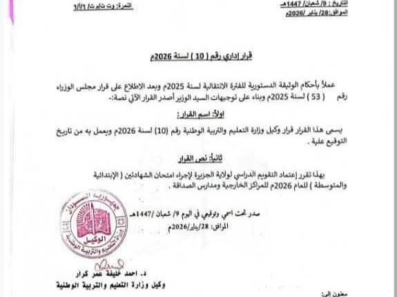 أصدر د. أحمد خليفة عمر، وكيل وزارة التربية والتعليم الاتحادي، القرار الإداري رقم (10)، القاضي باعتماد التقويم الدراسي لولاية الجزيرة، وذلك لإجراء امتحانات الشهادة الابتدائية والشهادة المتوسطة للعام 2026م، الخاصة بالمراكز الخارجية ومدارس الصداقة السودانية بدول المهجر.