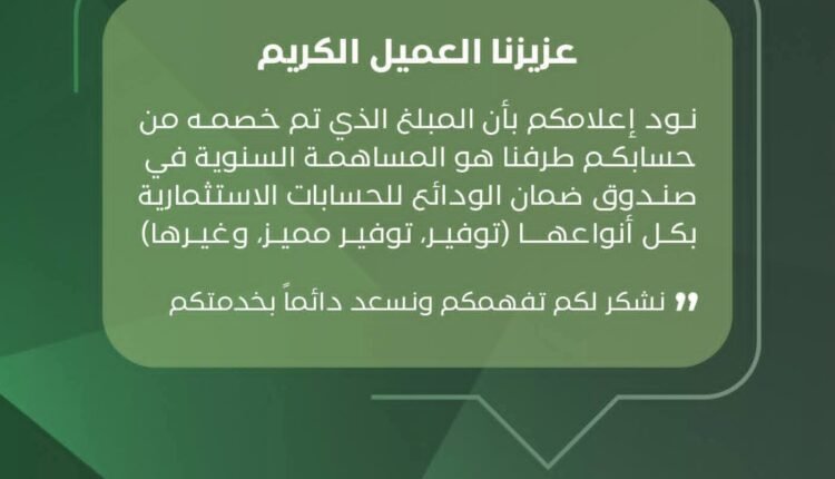 (عزيزنا العميل الكريم، نود إعلامكم بأن المبلغ الذي تم خصمه من حسابكم طرفنا، هو المساهمة السنوية في صندوق ضمان الودائع للحسابات الاستثمارية بكل أنواعها (توفير، توفير مميز، وغيرها).