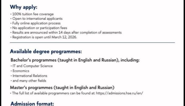أعلنت السفارة السودانية في موسكو، للطلاب السودانيين، أن التقديم لمنحة المدرسة العليا للاقتصاد (جامعة HSE) لمرحلتي البكلاريوس والماجستير مفتوح الآن وحتى 12 مارس 2026.