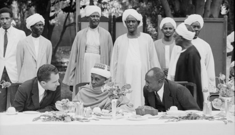 الصورة لزيارة السيد ريتشارد نيكسون نائب الرئيس الأمريكي إيزنهاور في زيارته للسودان لتسويق المعونة الأميريكية عام 57 وقد زار نيسكون الكثير من القيادات الطائفية بالسودان والسياسية وبعد زيارته للسيد عبدالرحمن زار السيد علي الميرغني وكان في صحبته رئيس الوزراء عبدالله بك خليل، وقد صار نيكسون من بعدها رئيساً لأمريكا من 63 حتى 69 حيث إضطر بعدها أن يقدم إستقالته بعد فضيحة (ووترقيت) التي فجرتها الواشنطون بوست وكشفت فيها تجسس وتصنت الجمهورين على مقر الحزب الديمقراطي.