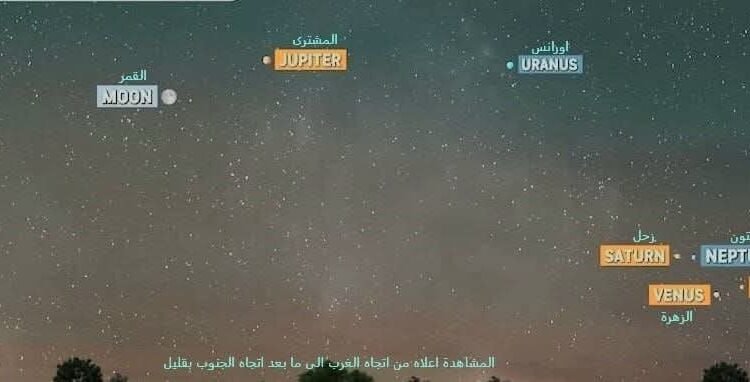 وأضاف أن كوكبي الزهرة والمشتري يعدان الأكثر وضوحاً للعين المجردة بعد الغروب، بينما يكون عطارد وزحل أقل سطوعاً ويظهران بصعوبة قرب الأفق، في حين يتطلب رصد أورانوس ونبتون استخدام تلسكوب.