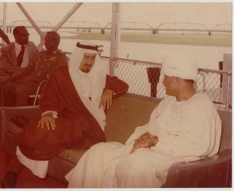 هذه الصورة التي نُهديها للأمير جلسة على النيل لا تُقدر بثمن يبدو فيها الرئيس جعفر نميري والملك خالد ومن ورائهم وزير الدفاع بشير محمد علي.