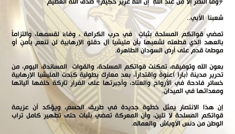 بعون الله وتوفيقه، تمكنت قواتكم المسلحة، والقوات المساندة، اليوم، من تحرير مدينة (بارا )عنوةً واقتداراً، بعد معارك بطولية كبّدت المليشيا الإرهابية خسائر فادحة في الأرواح والعتاد، وأجبرتها على الفرار تاركة خلفها آلياتها ومعداتها في الميدان.