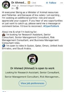 استخدم وزير الثروة الحيوانية والسمكية في السودان، أحمد التيجاني المنصوري، منصة التواصل المهني “لينكد إن” (LinkedIn) للإعلان عن حاجته لعمل إضافي بدوام جزئي، أثناء توليه منصبه الوزاري.