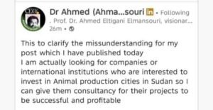 وفي منشور لاحق على ذات الموقع كتب المنصوري: “هذا لتوضيح سوء الفهم لمنشوري الذي قمت بنشره اليوم، أنا في الحقيقة أبحث عن شركات أو مؤسسات دولية مهتمة بالاستثمار في مدن الإنتاج الحيواني في السودان حتى أتمكن من تقديم الاستشارات لهم لكي تكون مشاريعهم ناجحة ومربحة”.