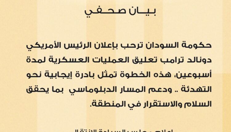 أعلنت حكومة السودان ترحيبها بإعلان الرئيس الأمريكي دونالد ترامب تعليق العمليات العسكرية لمدة أسبوعين، وقالت إن هذه الخطوة تمثل بادرة إيجابية نحو التهدئة. ودعم المسار الدبلوماسي بما يحقق السلام والاستقرار في المنطقة.
