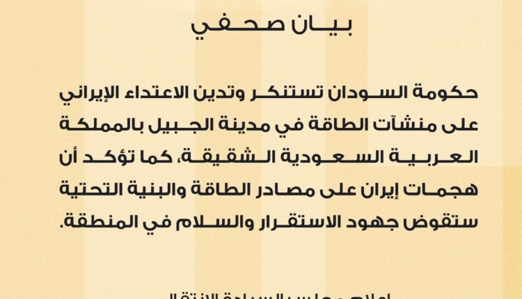 حكومة السودان تستنكر وتدين الاعتداء الإيراني على منشآت الطاقة في مدينة الجبيل بالمملكة العربية السعودية الشقيقة، كما تؤكد أن هجمات إيران على مصادر الطاقة والبنية التحتية ستقوض جهود الاستقرار والسلام في المنطقة.