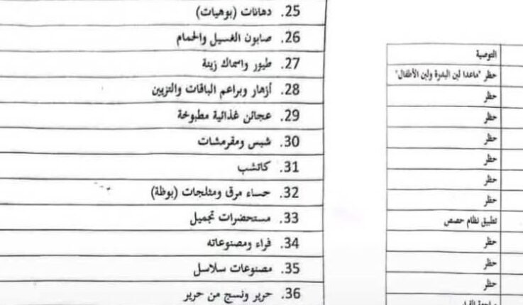 وشملت قائمة الحظر عدداً من السلع الاستهلاكية، من بينها منتجات غذائية معبأة وبعض المستلزمات الشخصية أبرزها “الأندومي” (الشعيرية سريعة التحضير) إلى جانب الشعر المستعار (الباروكات)، إضافة إلى سلع أخرى لم يتم الكشف عنها بالكامل في البيان الرسمي.